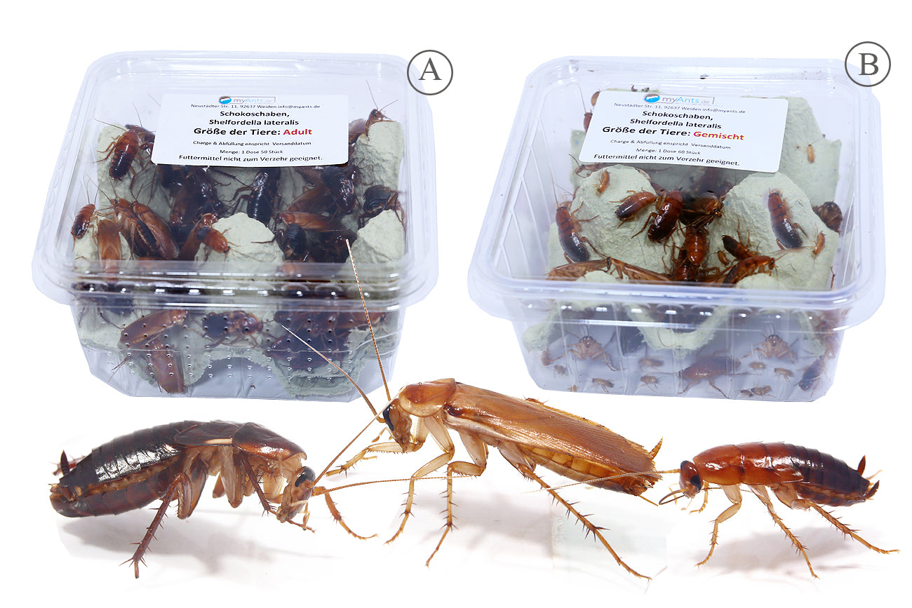 Schokoschaben sind mittelgroße Schaben die über keinen harten Panzer verfügen und somit von allen Ameisenarten bestens angenommen werden. Diese Schabe wird als ultimatives Futtertier für Ameisen und Reptilien empfohlen.